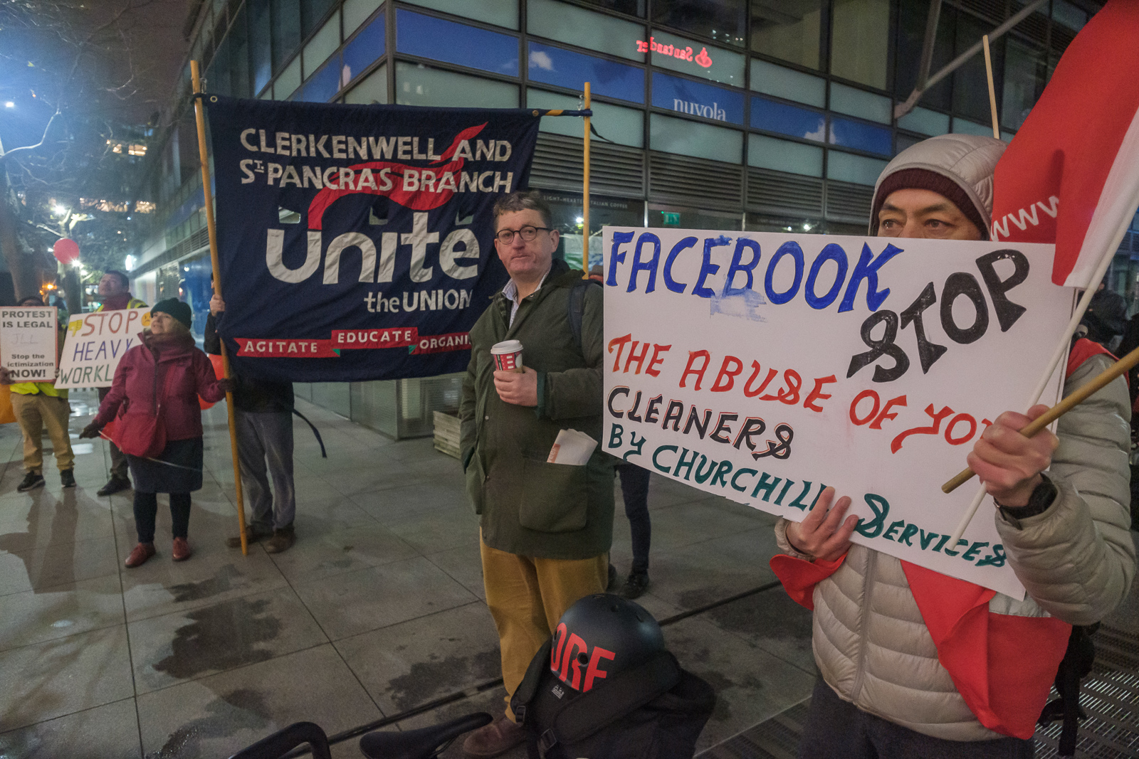 London, protest, Facebook, cleaners, CAIWU, Allied Independent Workers, excessive worklods, Churchill Cleaning, Churchill, JLL, facilities management, cleaning contractor, outsourcing, outsourced workers, cancel Facebook, #FacebookEndOutsourcing, #Churchill_Group, #jlluk, samba, @baquedeaxe, street performers, Glenroy Watson, RMT, black solidarity, James Farrar, General Secretary, ADCU, Guillermo Camacho, victimised, trade union activities, unfair dismissal, organiser, Alberto Durango,