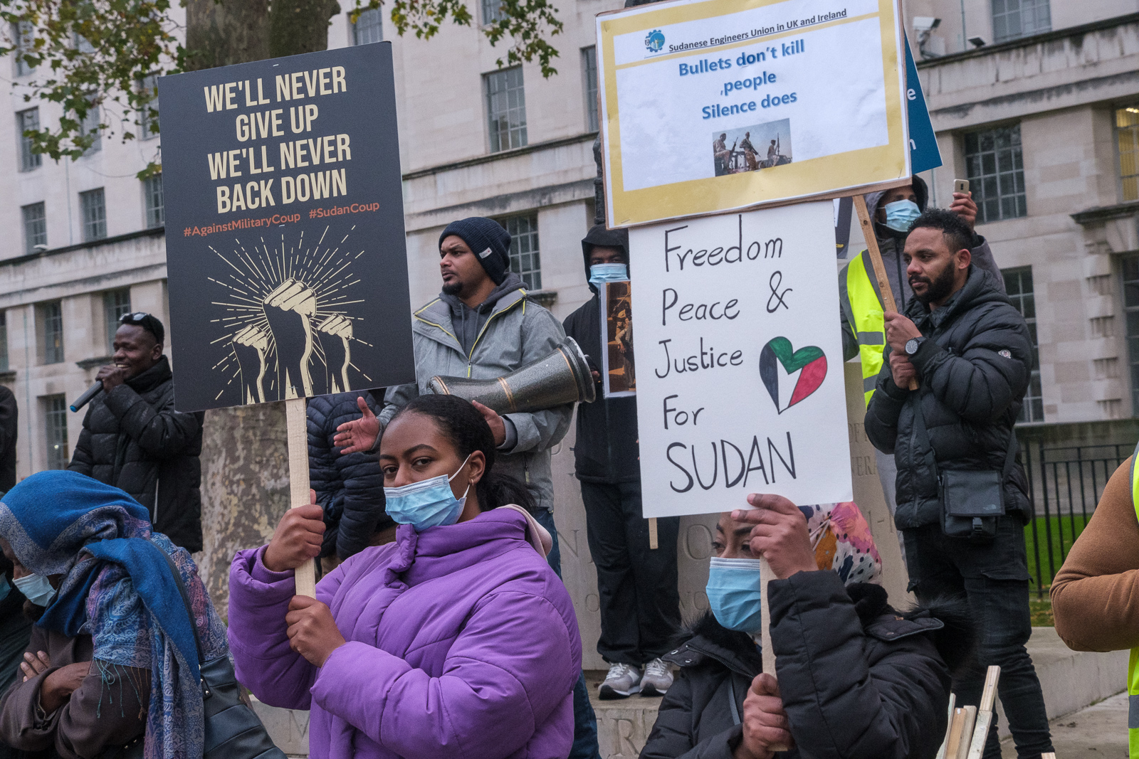 Sudan, protest, military coup, violence against protesters, protesters killed, state of emergency, Abdullah Hamdok, Hamdok, arrests, imprisonment, security forces, mass demonstrations, solidarity with protesters, Khartoum, Omdurman, return to civilian rule, civilian rule, no to military rule, rally, Gen Abdel Fattah Burhan, Burhan, solidarity, democracy, Downing St, London,