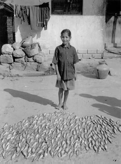 | Picture © Roberto Arendse 1997; Girl with drying fish, Kanniyakumari, India |