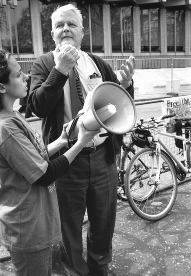 Bruce Kent outside us embassy, grosvenor sq, 20 april