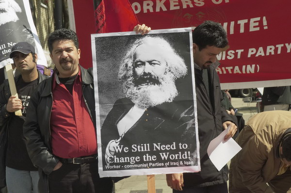 may day has perhaps settled into a rather predictable event now. the socialist left - and what is left seems to be a few unions and a number of ethnic communist party groups - march from clerkenwell to trafalgar square, while anti-capitalist protestors do not a lot around town. i started with the old left, stopped off at holborn to meet some animal rights people, walked with them to a minor scrum at the top end of covent garden, then followed what looked like a interesting group heading east for a while, before turning back to catch tony benn addressing the socialist remnant in trafalgar square.