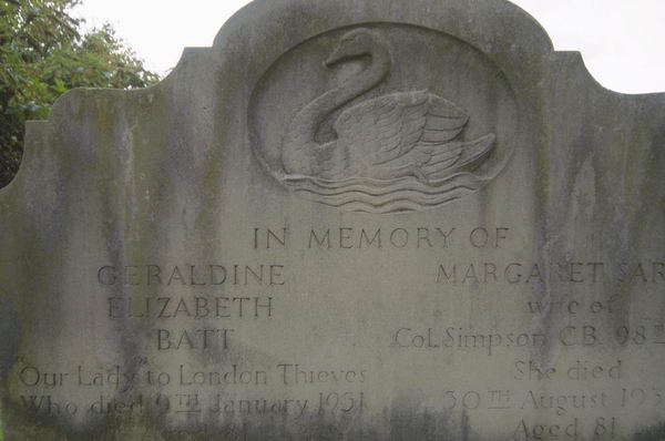 Gravestone of Geraldine Elizabeth Batt, "Our Lady" to London Theives who was buried at North Ockenden in 1931. I can't find any information on her on line. |