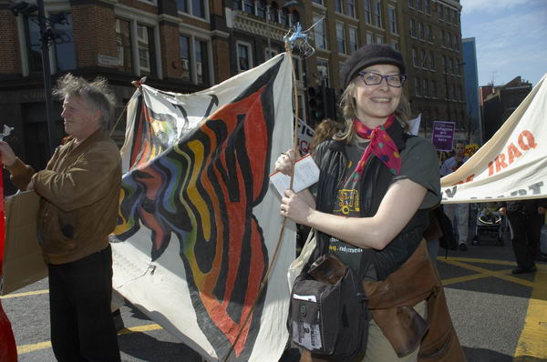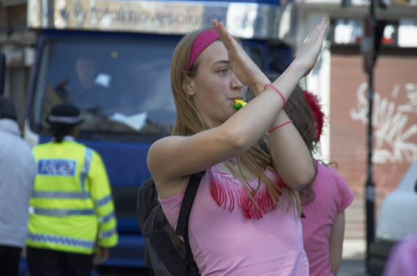 ![]() Four young women carried a large pink banner, "Queers without borders." ![]() The leader of the samba band |