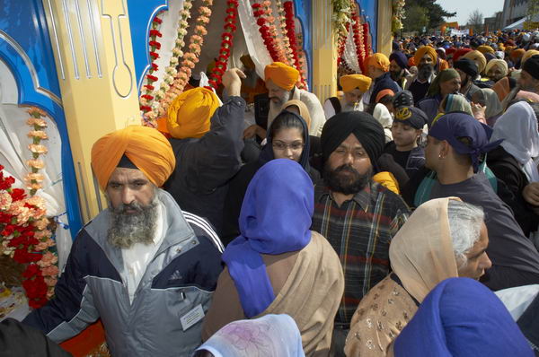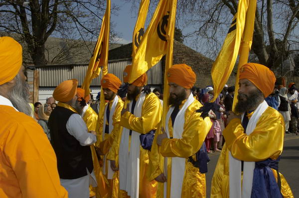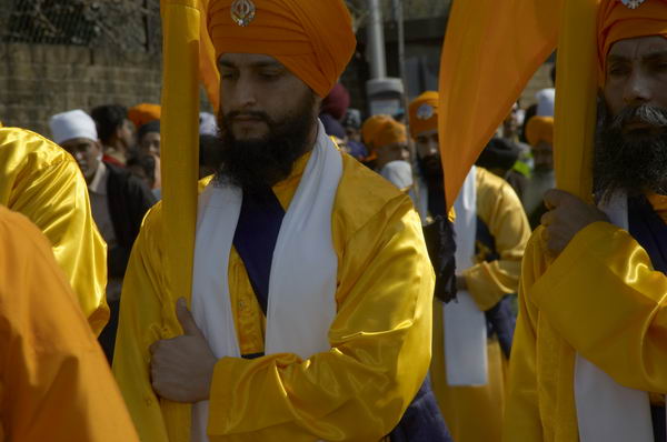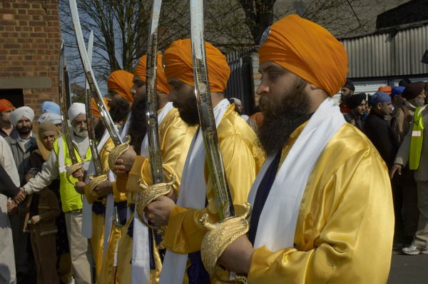 ![]() Behind the flag came a row of five Khalsa with swords held erect. |