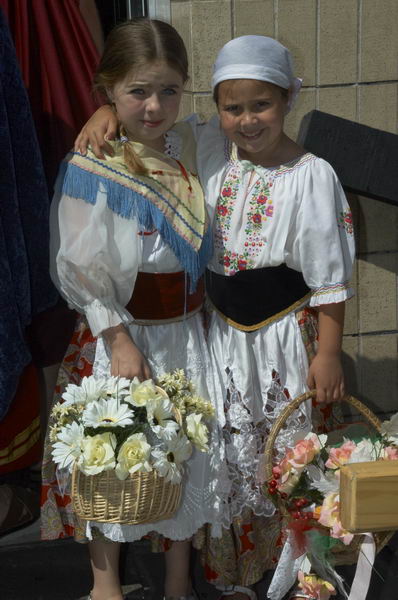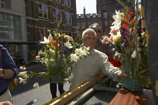 ![]() Bringing out the flowers from the Italian church (St Peter's, Clerkenwell) to decorate a float carrying one of the statues. |