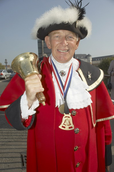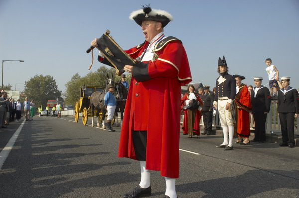 Bill Wright reads out the news while mayors, Lieutenant Lapontiere and coach wait on Staines Bridge |