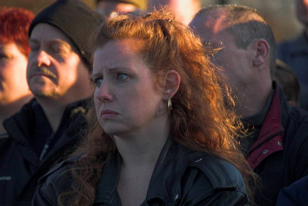 ![]() On the other side of the fence, the protestors kept up a noisy chant |