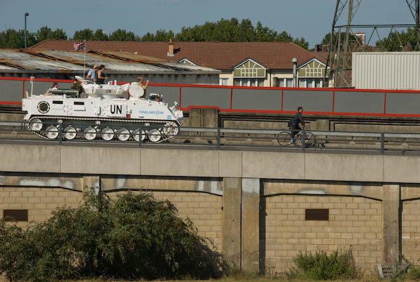 i was slowly making my way around the the tidal dock basin road which leads to the main vehicle entrance to excel. the space hijackers had announced they would be bringing a tank to the fair, and this seemed to be the likely route they would take.