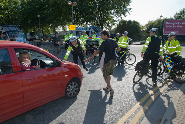 when people began to leave the arms fair, the protestors were able to make a very visible and audible protest as they drove slowly by. at one stage the police helped by blocking the traffic for a while so they could get a better view of the protest.