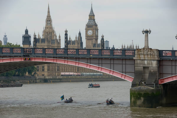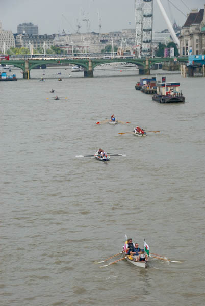 ![]() Leading boats in the Great River Race go under Lambeth Bridge towards the Houses of Parliament. |