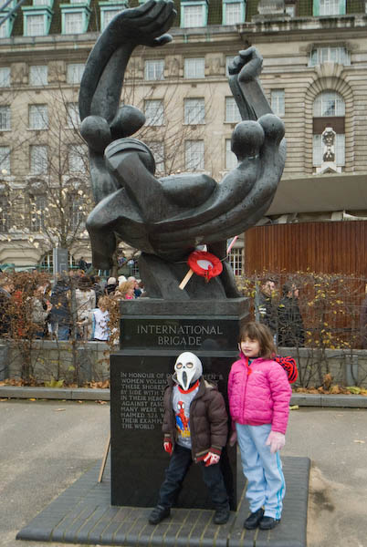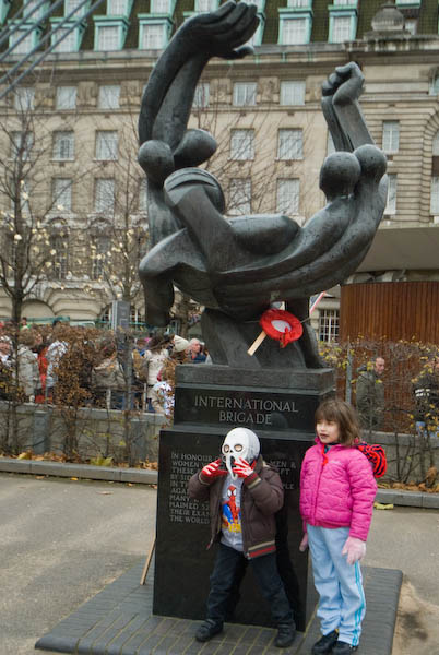 Kids posing for photographs at the International Brigade monument in Jubilee Gardens |