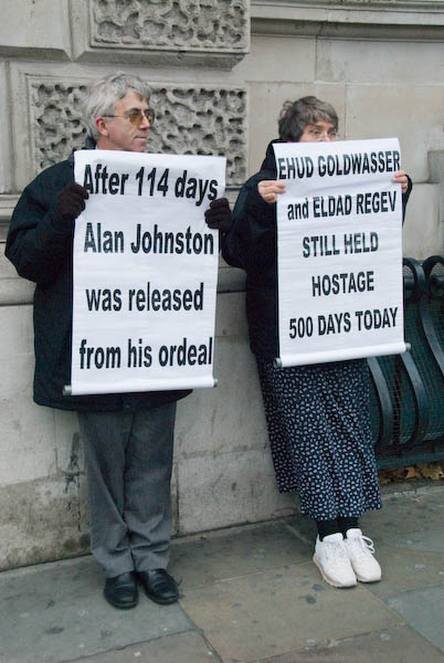 ![]() Demonstrators in Parliament Square to mark 500 days in captivity for the two Israeli soldiers whose capture by Hezbollah led Israel to attack Lebanon. |