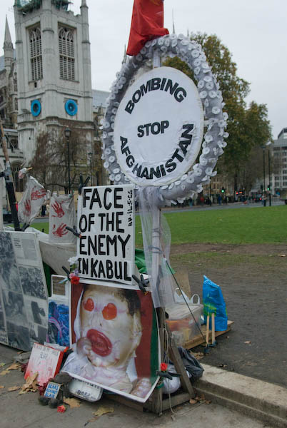 ![]() A big white poppy says 'Stop Bombing Afghanistan' in Brian Haws's Parliament Square display |