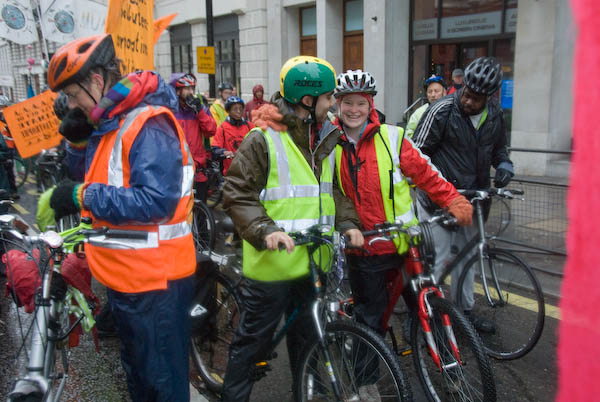 ![]() Cyclists arrive to support picket at Tesco Metro |
