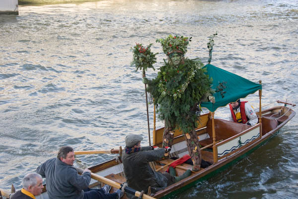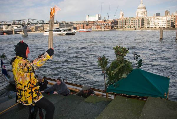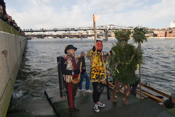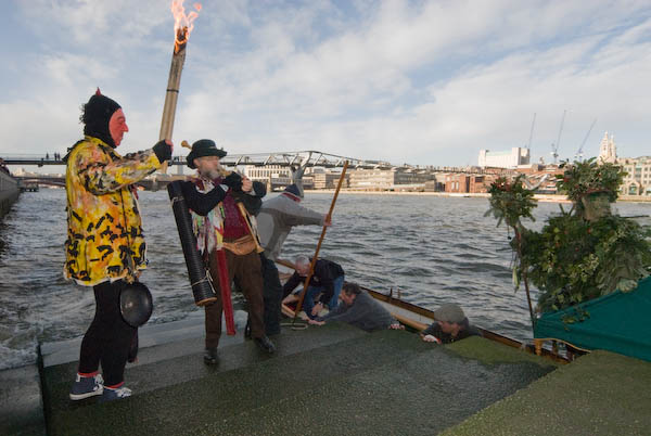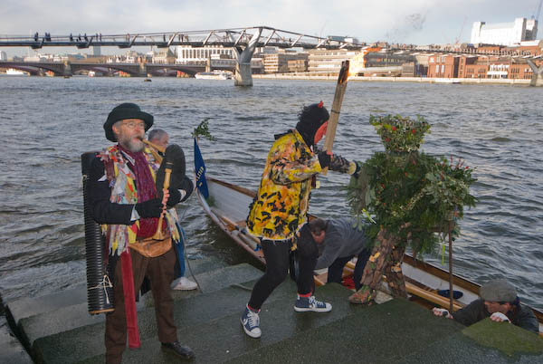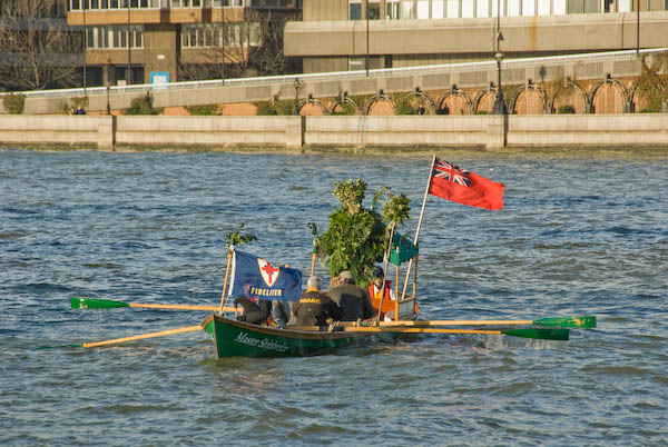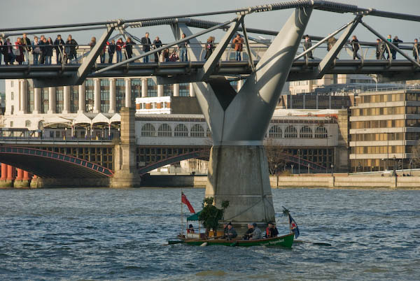 The Thames Cutter, Master Shipbroker, brings the Hollyman and bagpiper under the Millennium Bridge