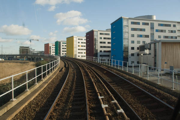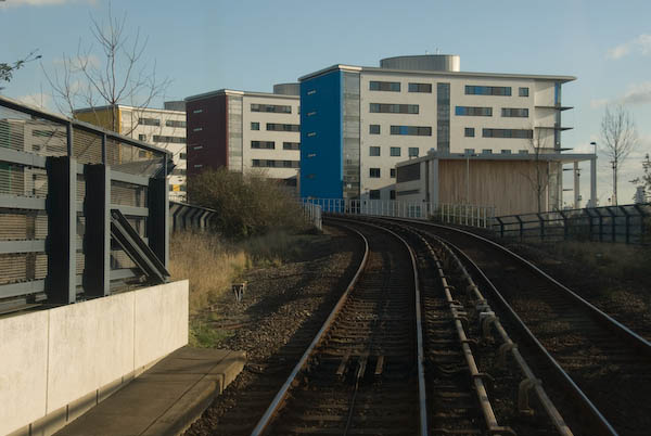 ![]() Approaching Royal Albert, with the business centre, the Royal Albert Dock and a plane shortly after take-off from London City Airport |