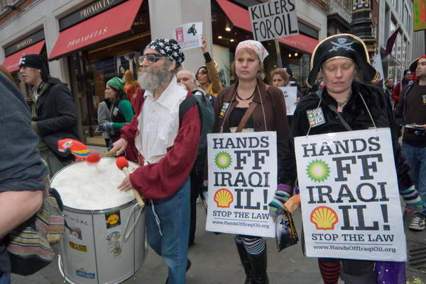 The Hands off Iraqi Oil Piratical Action Tour of London turned out to be quite a fun event, helped both by the costumes and the rousing beat of samba band Rhythms of Resistance. It was at the same time a highly serious protest, part of an international campaign in solidarity with the Iraqi people against the corporate theft of Iraq's oil.