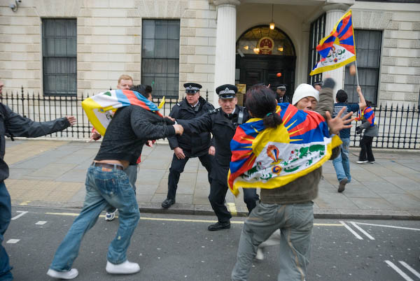Around a thousand marched from the Chinese Embassy to a Whitehall rally to remember the Tibetan uprising 49 years ago and to demand that Gordon Brown meet the Dalai Lama and end British silence over Chinese human rights abuses in Tibet. The event started with a demonstration opposite the Chinese embassy in Portland Place, and a small deputation - including two men in a yak costume went across the road to attempt to deliver a message to the Chinese embassy.