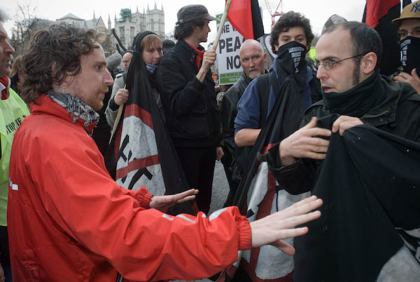 The Stop the War steward asks FITWatch to move out of the way of the march in Bridge St