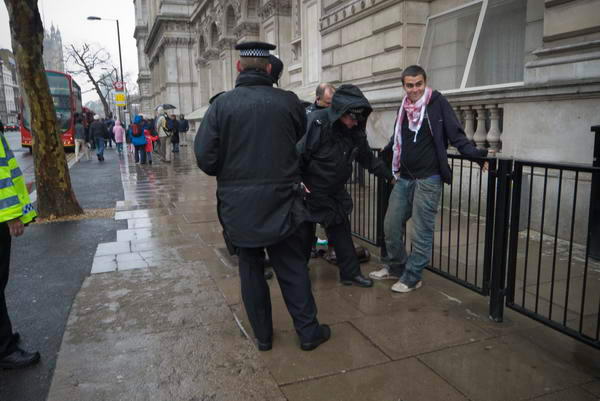 ![]() After a police request from the officer at the left edge of the frame I moved further away and continued to take pictures. While I was here a woman officer came up and put her hand over the front of my lens. I told her she was not allowed to do this and that her senior officers had said that it would be a very serious offence if police tried to stop photographers taking pictures in this way. She immediately rushed away across the road. |