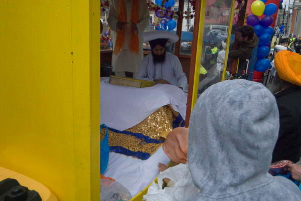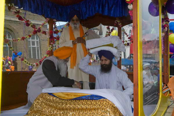 ![]() The Sikh Holy book, the Guru Granth Sahib, is carried out to the Palki lorry |