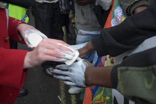 ![]() White paint on hands and heads of the demonstrators |