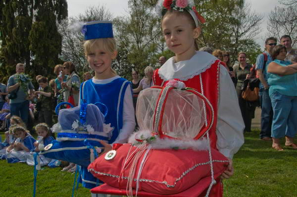 ![]() The crown-bearers with the crowns for the Bromley Common (blue) and Shortlands (red) May Queens |