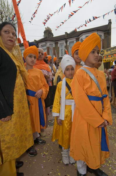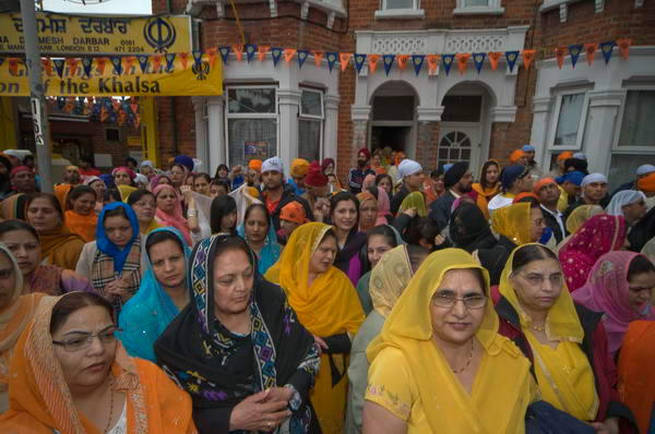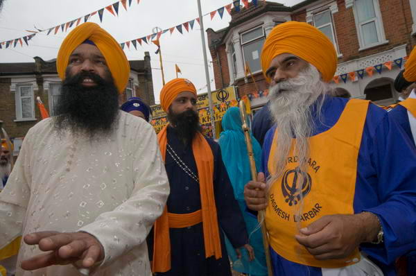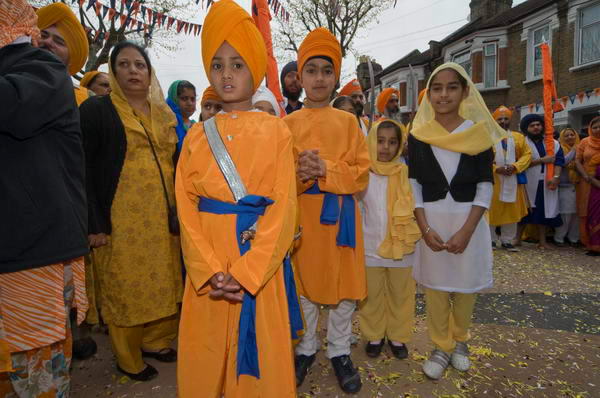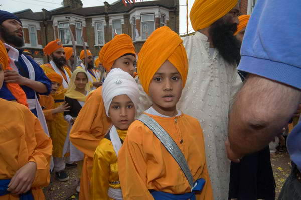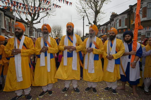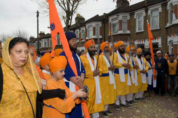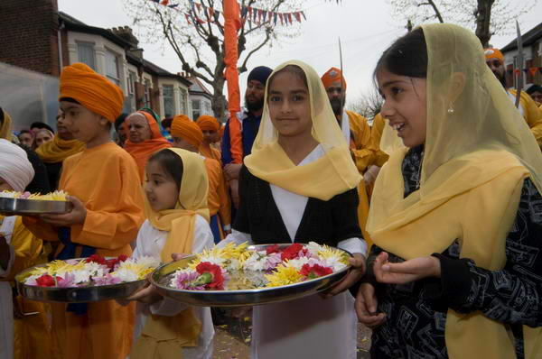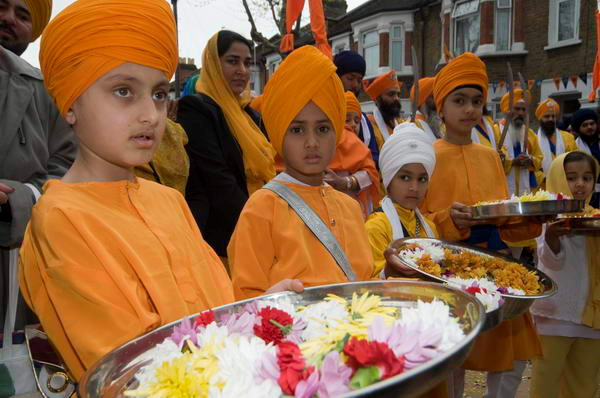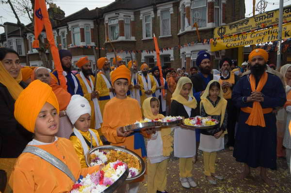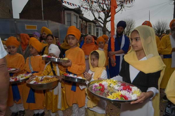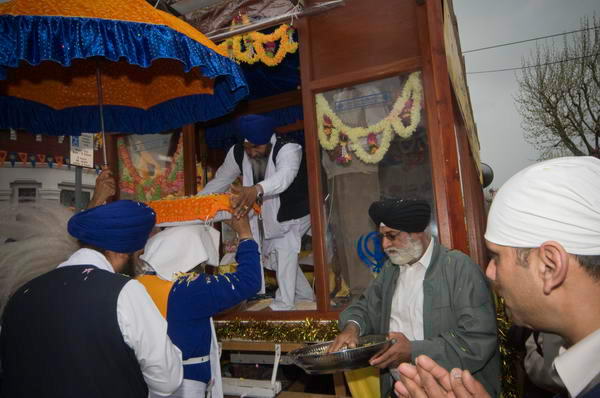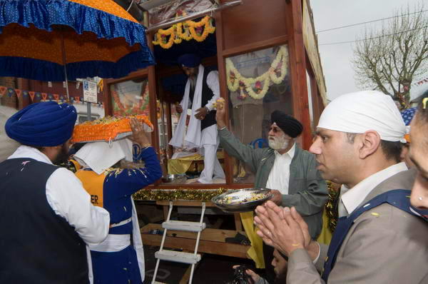 The Guru Granth Sahib is taken onto the decorated float for the procession