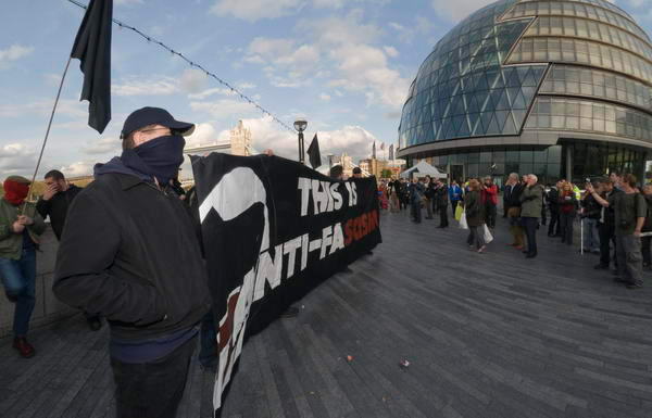 So I was pleased that people from various anarchist groups had joined together to protest at the result of the London Mayoral elections, even though I would have been considerably more pleased if they (and another 140,000) had voted for Ken. For all his faults, London would have had a better prognosis had he won. There had also been rumours that BNP supporters would be present (unfortunately they had more reason to cheer than most of us), but by the time I left, over an hour after the results had been expected, but several hours before they were actually announced, none were making themselves visible.