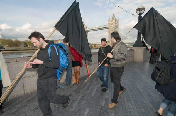 ![]() The first anarchist banner was held up outside City Hall at 18.19 by two young anarchists, stating 'THIS IS OUR LONDON'. |