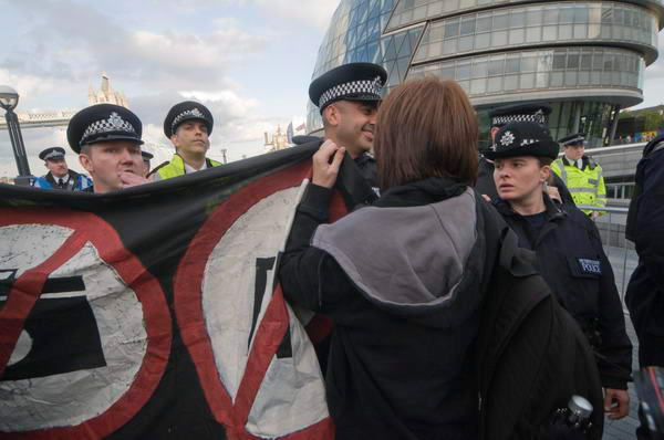 ![]() Pushing the demonstrators towards the pen about a hundred yards west, just past the Scoop. |
