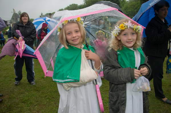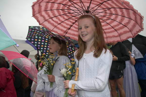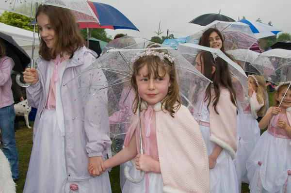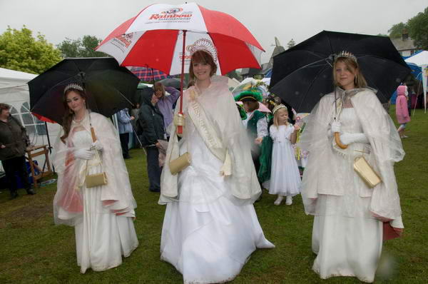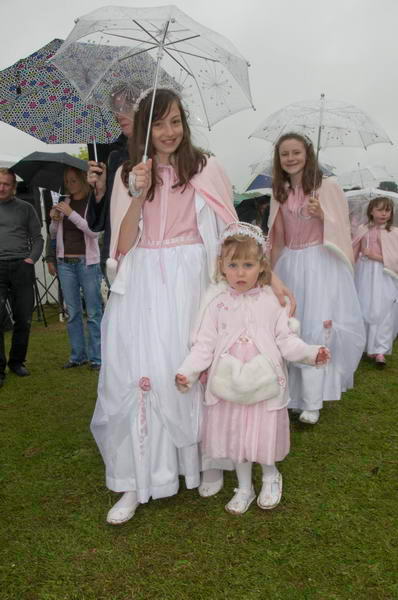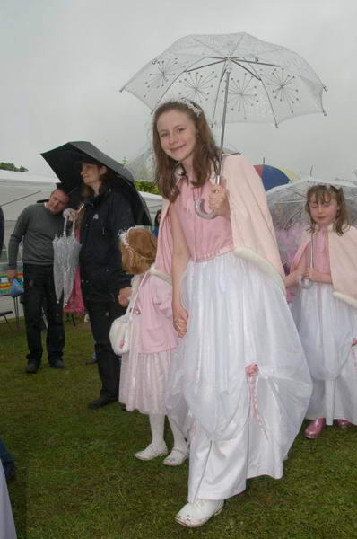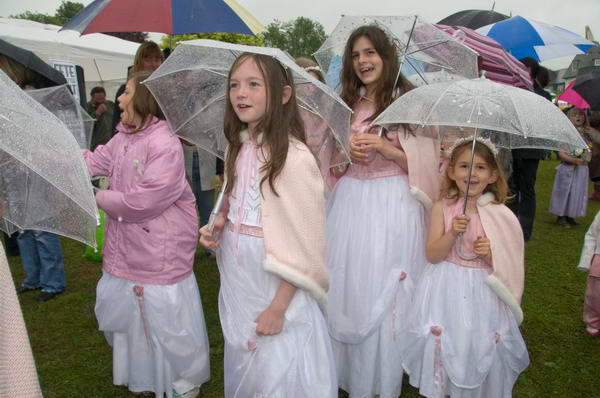 Spots of rain blur parts of the image of Miss Bromley and her senior princesses arrive at the Fete ground