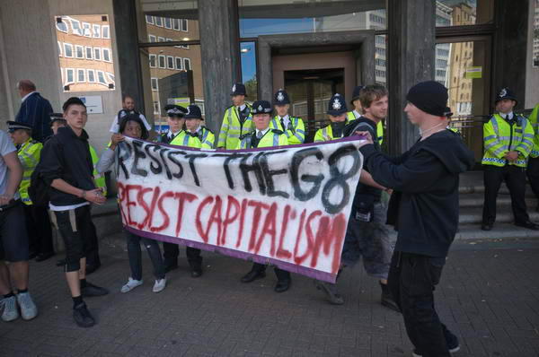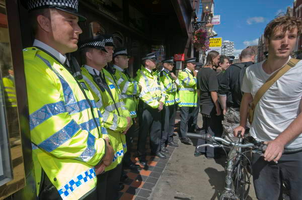 ![]() Rhythms of Resistance entertain a large crowd of police at Electric House (with many more behind me out of picture) |
