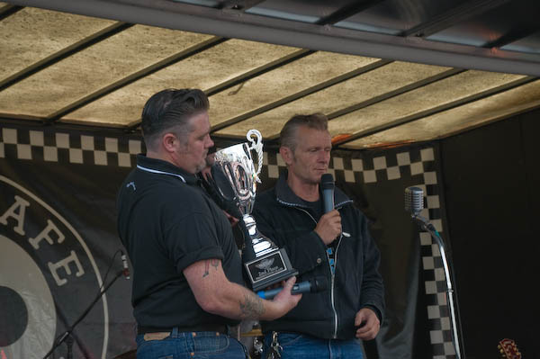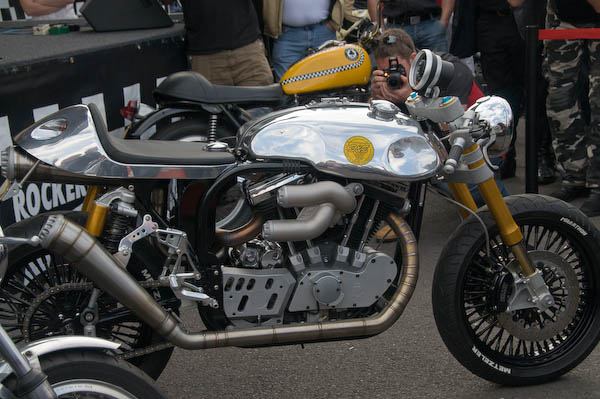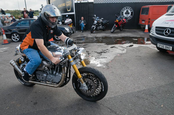 Little Miss Dynamite - a new Ace Cafe Racer - comes into the ring in the car park