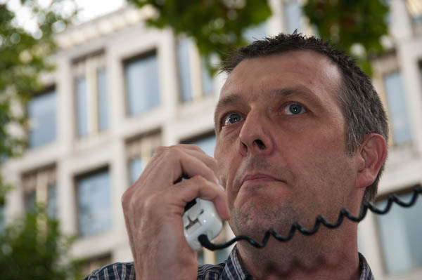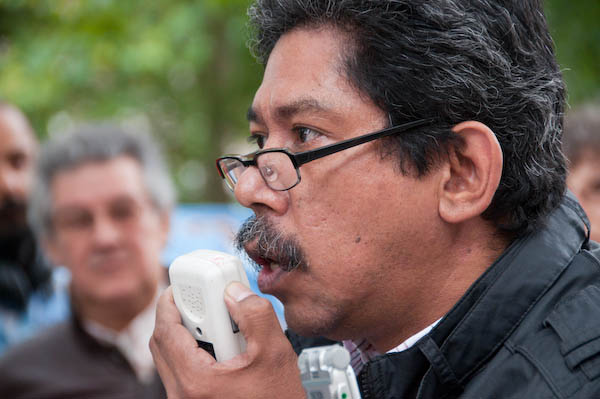 ![]() Jeremy Dear speaks. Behind him two supporters, one with a Venezualean flag, and watching in front of the US Embassy and armed policeman |