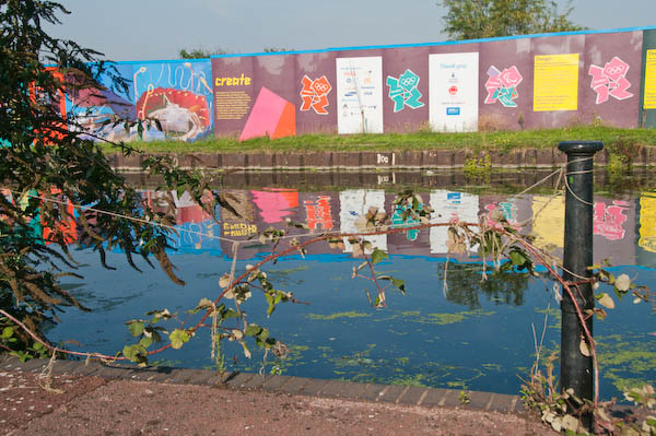 ![]() Leabank Square has its own wharf area - here selling secondhand books - opposite the decorated blue fence of the Olympic construction area |