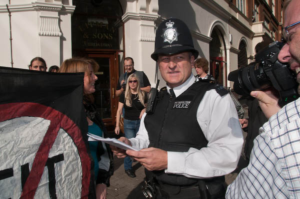 Police warn protesters they are in the SOCPA area and try to hand out notices as photographers watch