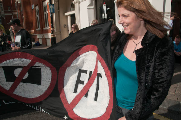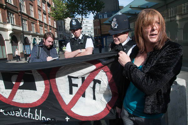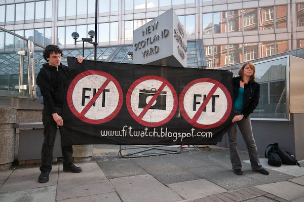 The Fitwatch banner outside New Scotland Yard - and the policeman with some SOCPA notices