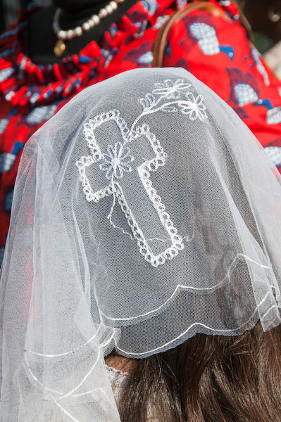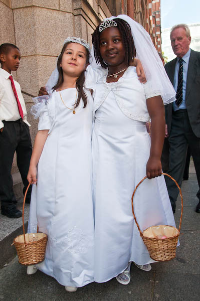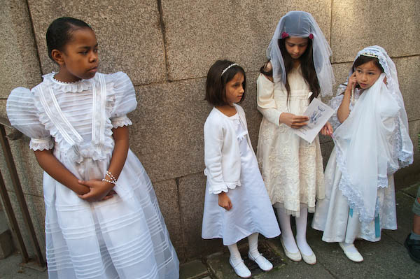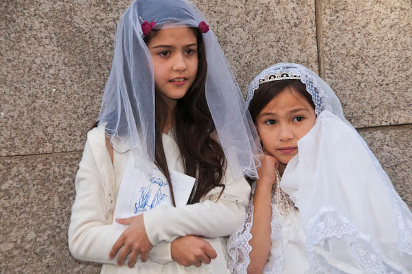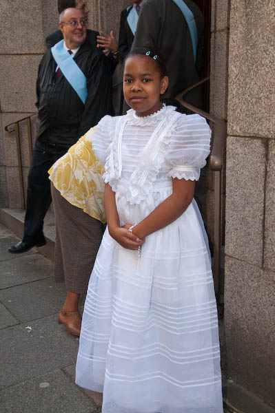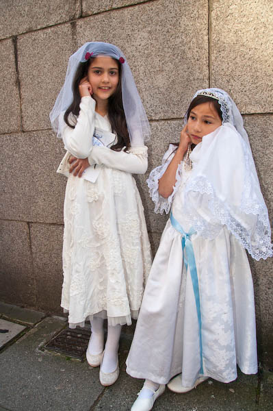 ![]() Girls in white communion dresses accompany the statue of Our Lady of Fatima |