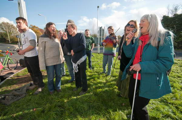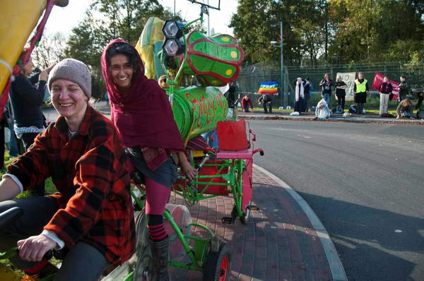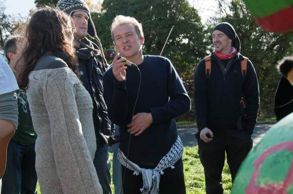 ![]() Entertaining the protesters and police at the main gate ![]() With Rinky-Dink providing amplification |