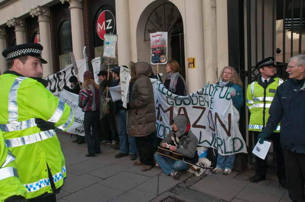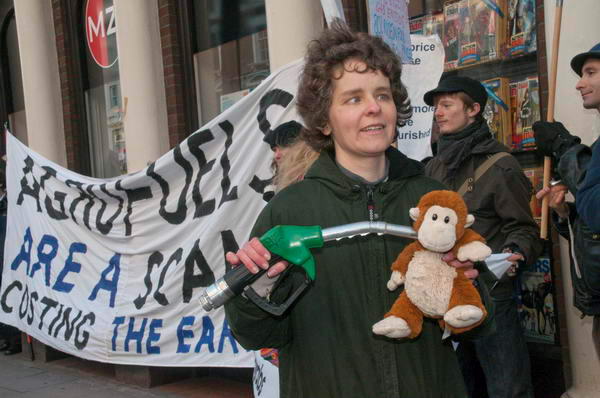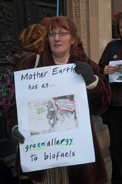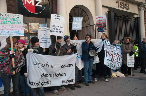 ![]() Were a group of Biofuelwatch demonstrators were waiting for them outside the offices of Greenergy, the UK's largest biofule supplier |