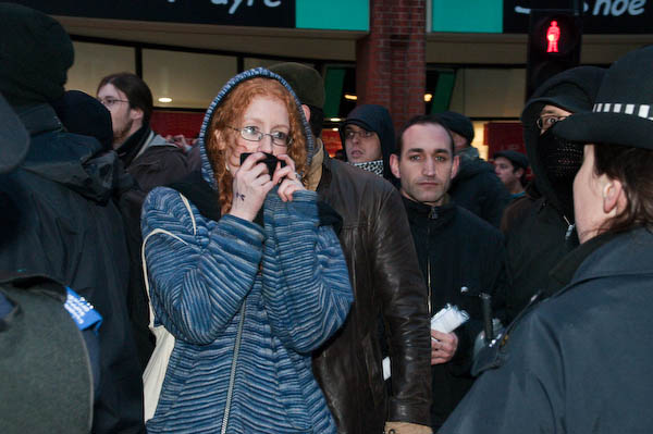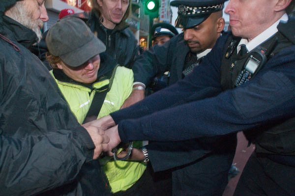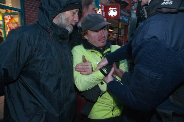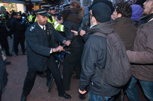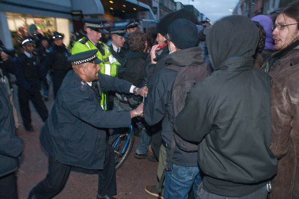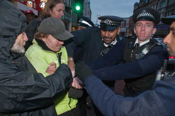 ![]() This arrest provokes the crowd to break out into the road, and to urge those in the pen to break out - but police hold them back |