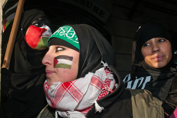 Perhaps 2-3,000 almost entirely Muslim men and women then marched down Park Lane led by men carrying posters against the occupation of Palestine, Iraq and Afghanistan and an end of support for 'Arab puppet tyrants.' Behind these, men carried 3 black 'coffins', all with the message 'Killed in Gaza' on one side. On the other, one had 'Killed by Mubarak', the second 'Killed by King Abdullah' and the third, 'Killed by Assad.' Most women marched in a separate block led by female stewards in the centre of the demonstration.