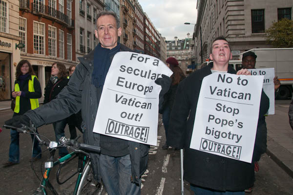 I joined the march as it came up Piccadilly, with around a hundred people. It was an event to show solidarity with the considerably larger march taking place at the same time in Rome, protesting against the Vatican and its intervention in Italian, European and world-wide politics.