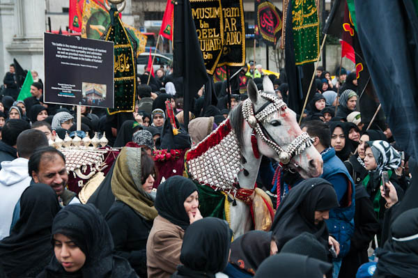 The Husaini Islamic Trust UK was formed in 1982 and since then has organised an annual Muslim Arbaeen procession, the first such procession in Europe and America. This year was the 28th and included several replicas of shrines (Shabbihs) and the cermemonial horse (Zuljanah) of Imam Husain and the cradle of Hazrat Ali Asghar, along with several thousand men and women with many flags, placards and banners.