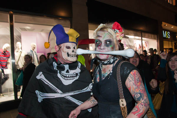 Skull and Crossbones and a bone, Oxford St A Zombie Shopping Spree took place on Oxford Street starting from Oxford Circus, complete with coffins, a dead 'banker', posters, various members of the undead and a rather good band. Police watched in a suitably deadpan manner (I did see one or two occasionally smile) as the group assembled and applied large amounts of white makeup before making its way along the pavement of Oxford Street, to the astonishment (and often delight) of late shoppers and workers rushing home.