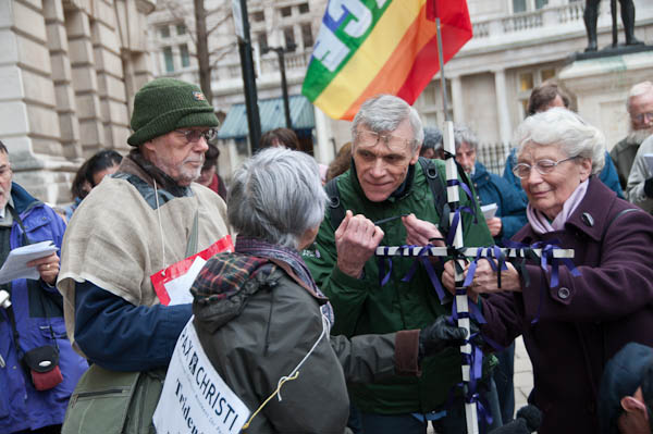 war and violence.Pax Christi and Christian CND have held an Ash Wednesday Liturgy of Repentance and Resistance at the Ministry of Defence in protest against the continued reliance on nuclear weapons every year since 1982. Around 70 Christians, including members of Catholic Peace Action attended, forming a circle in Embankment gardens where sticks of charcoal were blessed and the heads of those taking part marked with a cross of ashes.