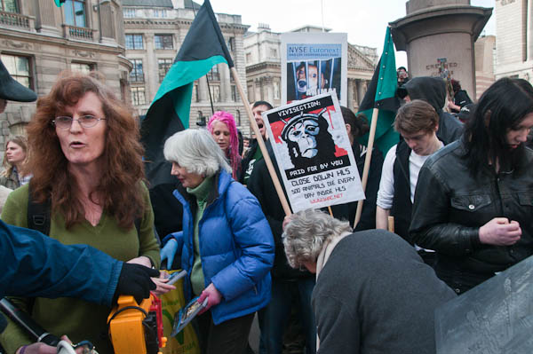 From the Bank of England the march went on to a Barclays branch in Wormwood Street, where it stopped for a few minutes to make its views known. Barclays are the largest shareholders in HLS and also support NYSE Euronext.