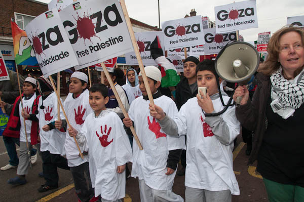 Around three hundred people, mainly Muslims, gathered outside Balham Mosque and after a short address formed up and marched along the main road south to Tooting, led by a lively group of children in white t-shirts with a 'blood-stained' red handprint and some of the women. The route led through some of south London's busiest shopping streets and marchers attracted considerable encouragement from shoppers.