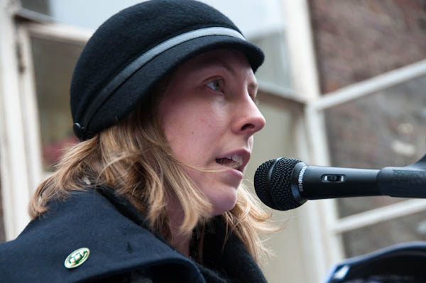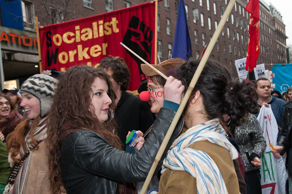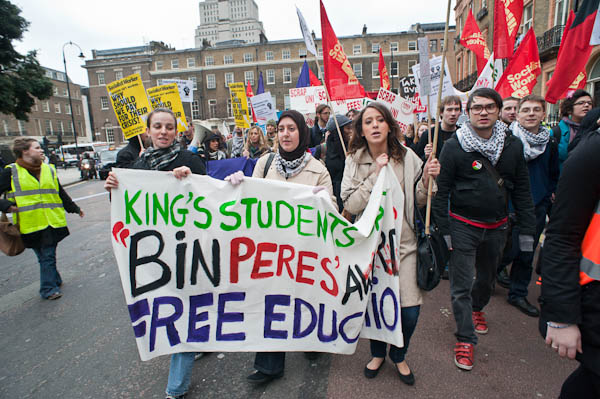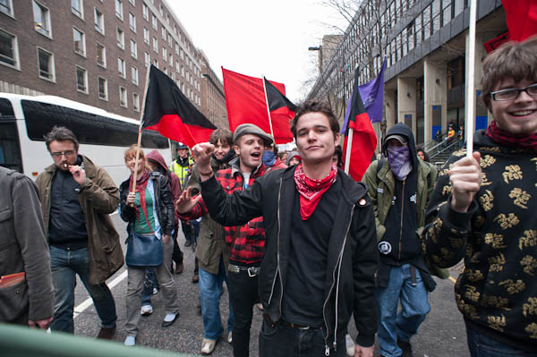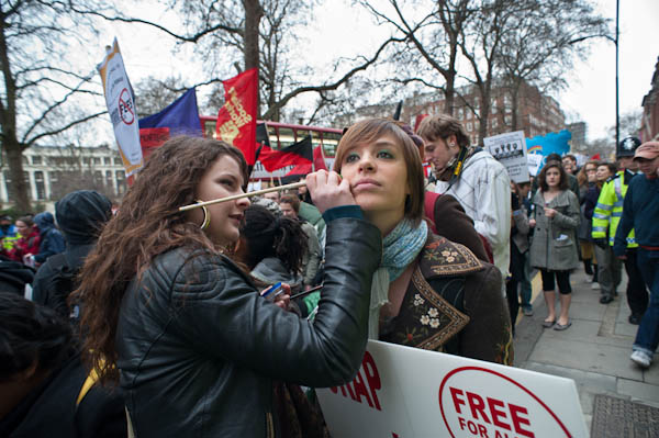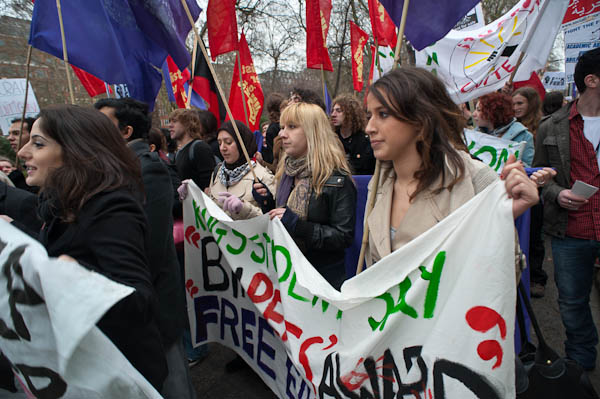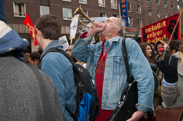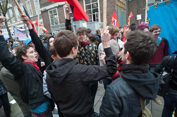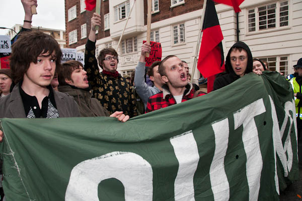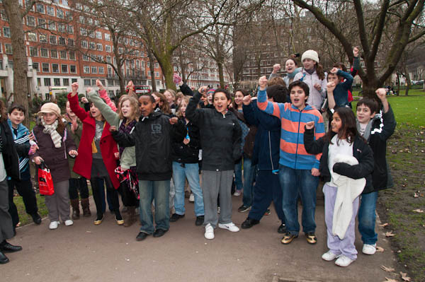In Tavistock Square a group of young schoolkids applaud the march (to the annoyance of their teacher)